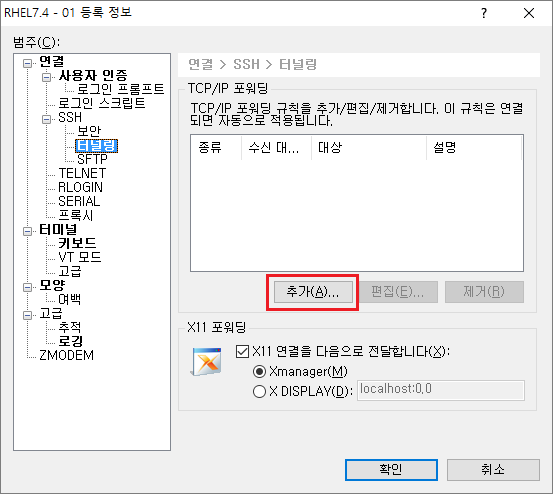 Xshell을 이용한다. SSH TUNNEL을 이용한 연결 테스트는 생략한다.- SSH 클라이언트 프로그램의 경우, 새로운 연결을 생성하거나 기존 연결을 수정하여