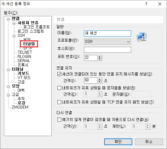 연결$\rightarrow$SSH$\rightarrow$터널링을 선택한다.