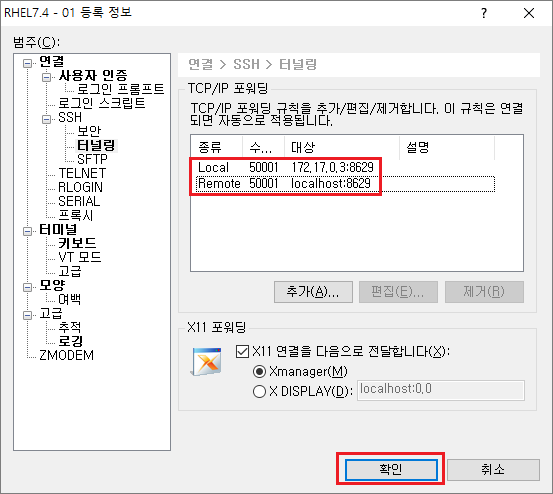 Remote Port Forwarding정보를 입력하고확인을 누른다.