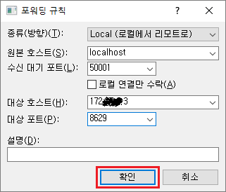 Local Port Forwarding정보를 입력하고확인을 누른다.
